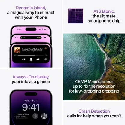- Dynamic Island, Always-On Display, Pro Motion Technology with Adaptive Refresh Rates Upto 120 Hz, HDR Display, True Tone, Wide Colour (P3), Haptic Touch, Contrast Ratio: 20,00,000:1, Max Brightness: 1,000 nits, Peak Brightness: 1,600 nits, Peak Brightness (Outdoor): 2,000 nits